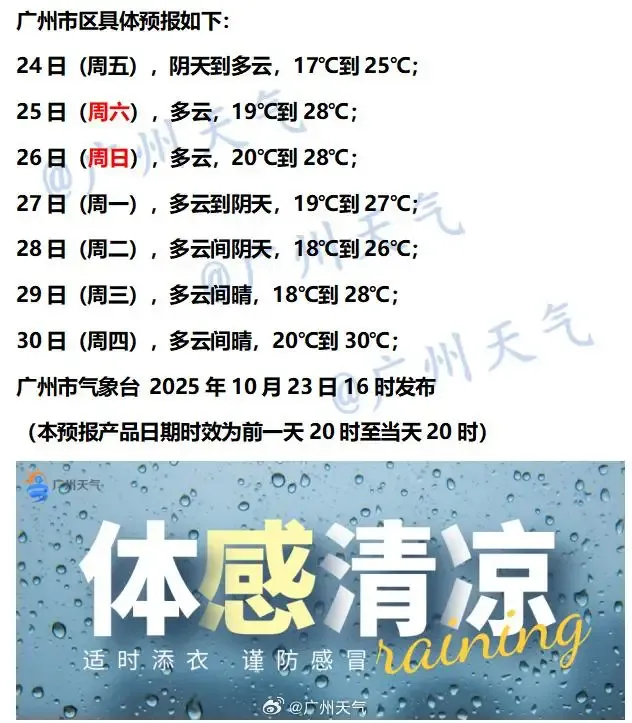 展望周末,又有弱冷空气补充影响,广州气温小幅下降。近期天气多变,大家注意适时添减衣被,谨防感冒。